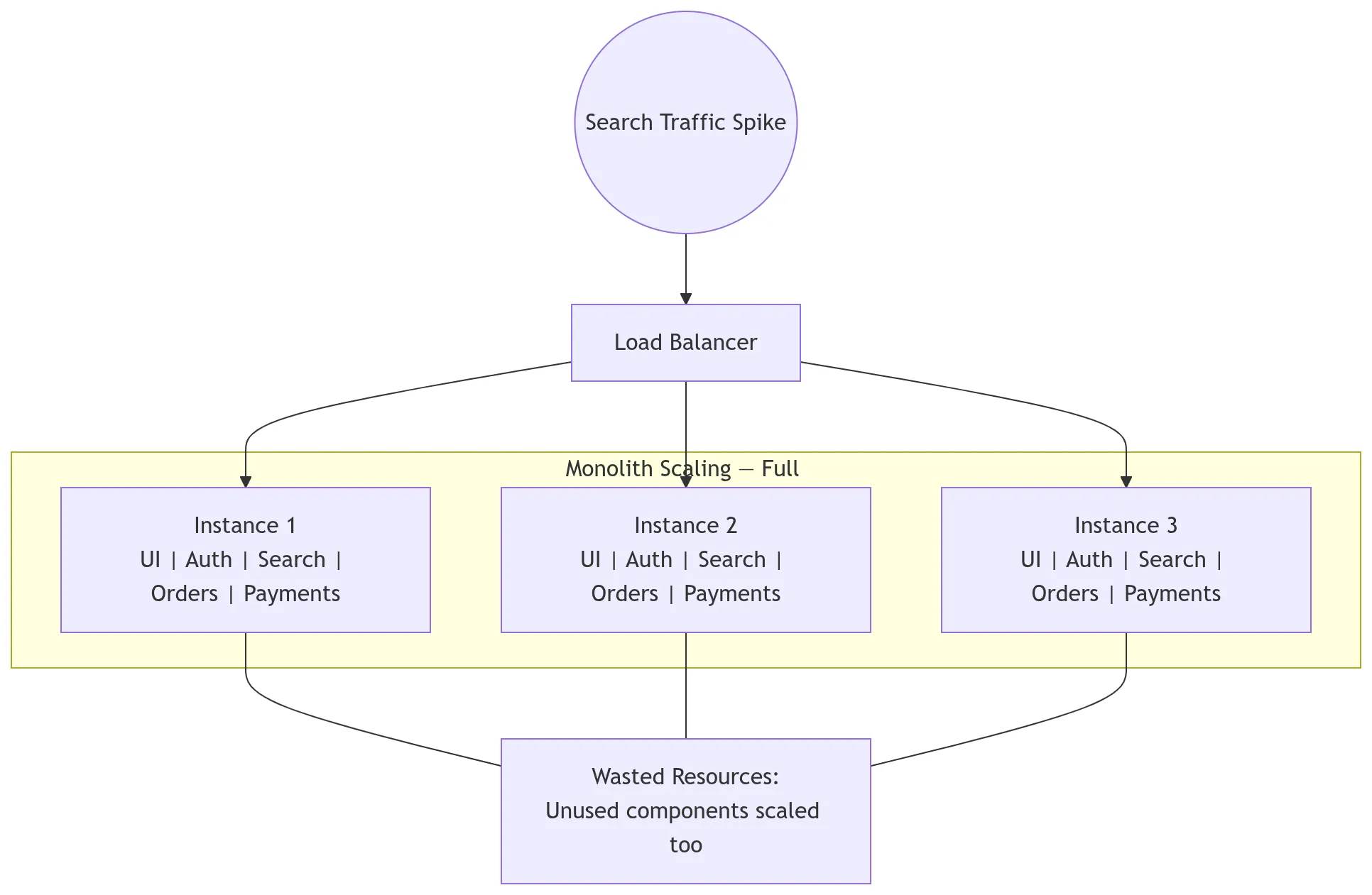 In a monolithic system, scaling is blunt. If one feature experiences heavy load — imagine the search function during a festival sale — you must scale the entire application. Even parts that aren’t under stress get duplicated. That wastes infrastructure and money.