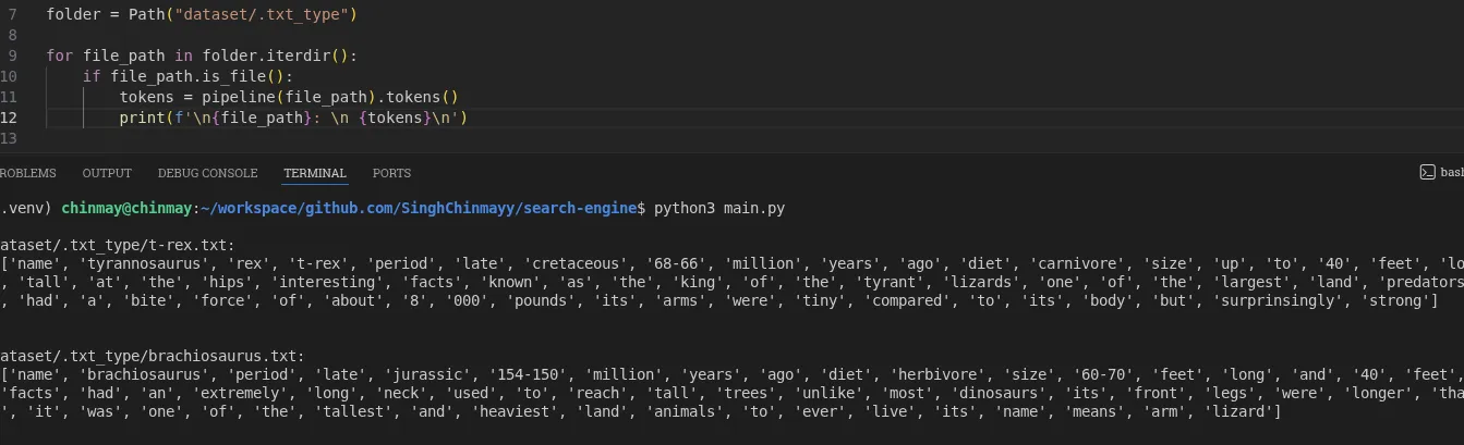 Once tokens and document IDs were available in the main flow, building the inverted index became straightforward. Think of it like a book index at the back: you look up a word and it tells you which pages mention it.