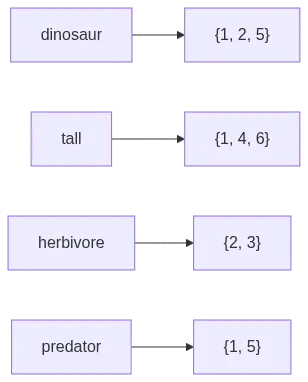 The structure is simple. A dictionary where each term maps to a set of document IDs.