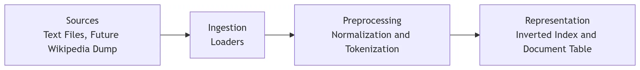 Before even thinking about indexing or querying, I designed the internal pipeline. Think of it like building a factory floor layout before buying any machines. Sources feed into ingestion. Ingestion feeds preprocessing. Preprocessing produces tokens. Representation will come later.