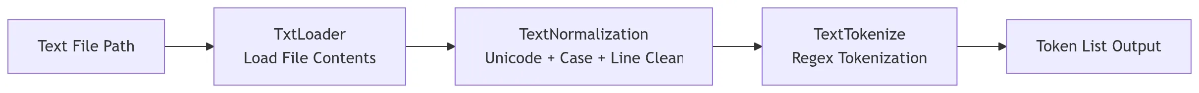 The loader reads text files. The normalizer cleans text. The tokenizer converts text into tokens. Each module does exactly one thing.